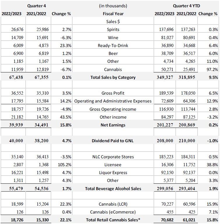 NLC reported net earnings for the quarter of $39.9 million, an increase of $5.4 million, or 15.8%, compared with Q4 of fiscal year 2022. Net earnings for fiscal year 2023 total $201.2 million, an increase of $0.4 million or 0.2% from the prior year. The dividend paid by NLC to the Government of Newfoundland and Labrador totalled $40.0 million for the quarter, $1.8 million higher than Q4 of the prior year. This brings the dividend remitted for the fiscal year to $208.0 million, $2.0 million lower than the same period one year ago. The difference is due to many factors, namely the new collective agreement and an increase in commissions to support licensed cannabis retailers, as well as increased freight and security costs during the year.