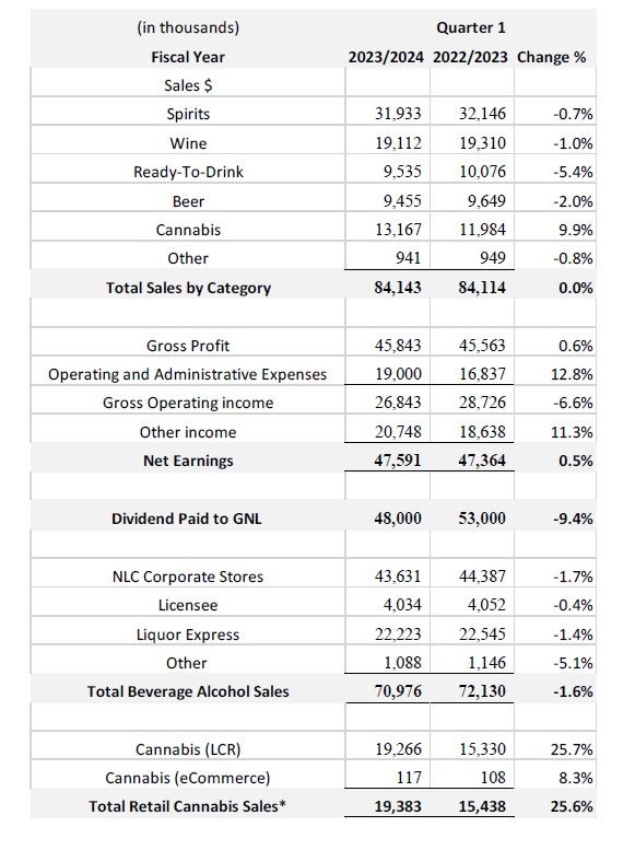 Sales through NLC’s corporate stores were down 1.7% compared to Q1 of the prior year, while Liquor Express outlets across the Province experienced a decrease of 1.4% compared with Q1 of the prior year. Sales through licensees were 0.4% lower than the prior year.