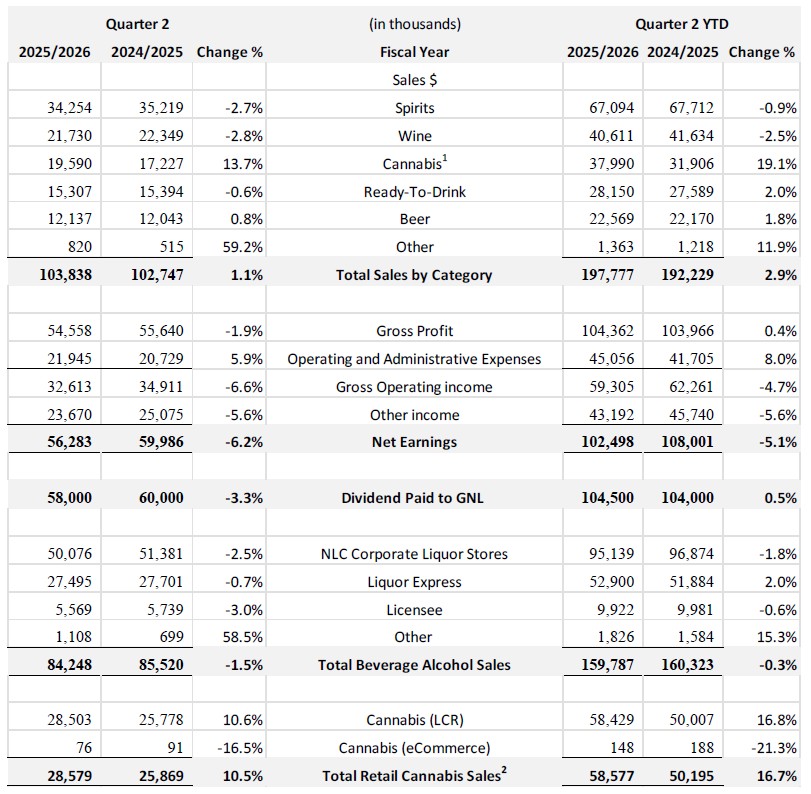 NLC reported net earnings for the quarter of $56.3 million, a decrease of $3.7 million, or 6.2%, compared with Q2 of fiscal year 2024-25. The decrease is due to reduced gross profit on beverage alcohol sales, partly due to the removal of higher-margin U.S. products, combined with a decline in beer commission revenue. NLC paid $58.0 million to the Government of Newfoundland and Labrador in the quarter, a decrease of $2.0 million compared to $60.0 million in the second quarter of fiscal 2025.