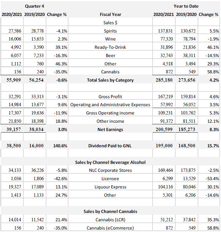 NLC’s sales performance reflected the continued impact of special public health measures from the Chief Medical Officer of Health and safety measures introduced by NLC, including restrictions on the access of customers to its corporate stores, increased cleaning and safety protocols and the continuation of online ordering and store pick-up “click-and-collect” process. The pandemic has caused significant changes in the buying patterns of our customers, with an emphasis on familiar brands and large format sizes. Sales through NLC’s corporate stores were down 2.5% compared to the prior year, mainly due to reduced customer traffic caused by the pandemic, while Liquor Express outlets across the Province experienced an increase of 30.1% over the prior year.