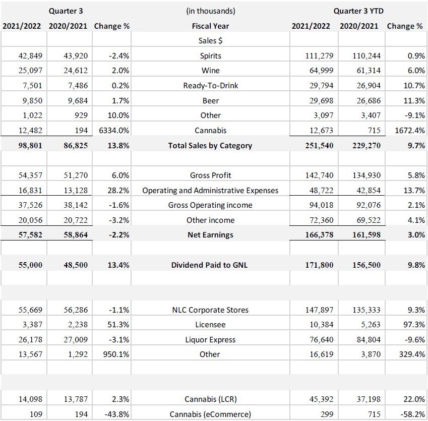 Sales through NLC’s corporate stores were down 1.1% compared to Q3 of the prior year, mainly due to what appears to be a return to pre-pandemic volumes, while Liquor Express outlets across the Province experienced a decrease of 3.1% over Q3 of the prior year.